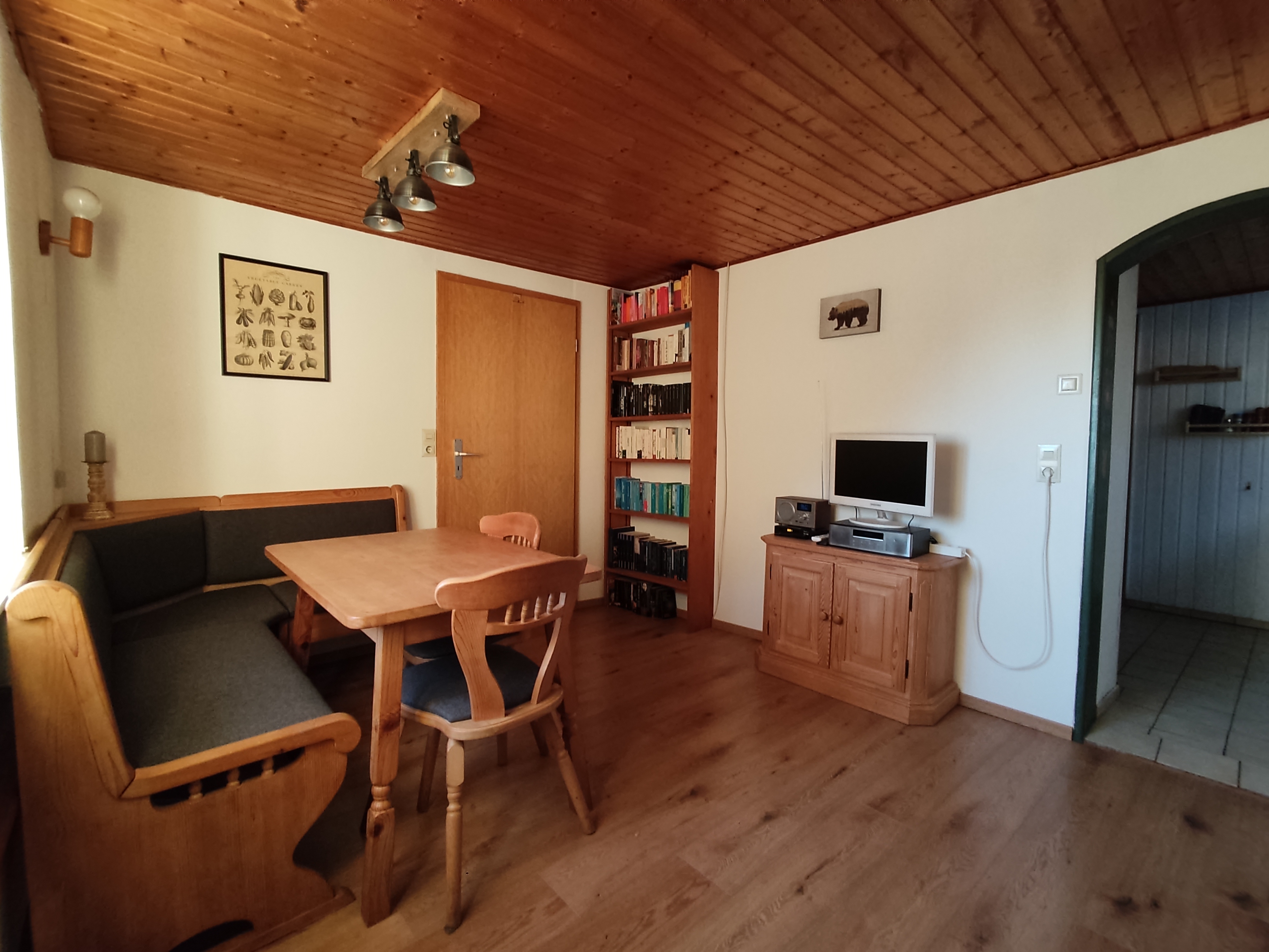 Im Ess- und Wohnzimmer lädt der Esstisch mit Eckbank zu einem gemütlichen Essen und geselligen Abenden ein. Außerdem befinden sich hier der Fernseher (Satellitenanschluss), Spiele und die ein oder andere Lektüre.